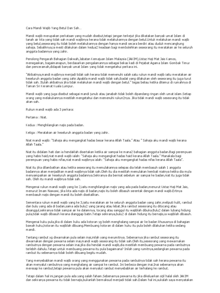 Cara Mandi Wajib Yang Betul Dan Sah from imgv2-1-f.scribdassets.com Mandi wajib atau mandi junub adalah diwajibkan bagi seorang muslim untuk membersihkan diri dari hadas besar. Pasalnya, seorang muslim harus bisa membersihkan atau menyucikan diri mereka dari hadas besar. Tidak kira juga menggunakan air untuk itu, ilmu cara mandi wajib ini perlu dipelajari. Aplikasi cara mandi wajib merupakan satu aplikasi yang dibangunkan oleh team krenovatif network yang bertujuan membantu pengguna android melalui aplikasi ini anda akan didedahkan dengan maklumat berkaitan tata cara mandi wajib/mandi junub/mandi janabat yang betul, sah dan sempurna. Membasuh kepala dengan mengusap rambut secara meratakan kepala lau siram 3 kali dengan air. Ada tata cara yang telah diajarkan rasulullah terkait dengan mandi wajib. Our system stores cara mandi wajib yang betul apk older versions, trial versions, vip versions, you can see here. Apabila seorang lelaki atau perempuan mengeluarkan air mani tidak mengira atas apa sekalipun sebabnya.